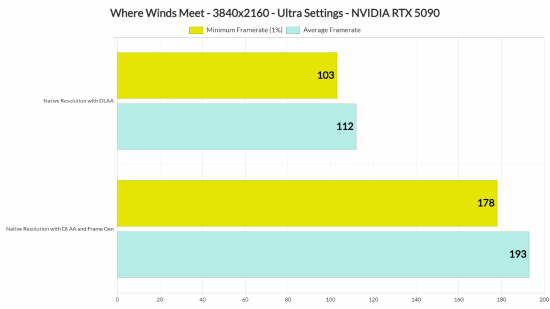 性能表现上,《燕云十六声》在原生4K、最高画质的设置下,搭载RTX 5090显卡时,帧率最低能达到115FPS,平均帧率为126FPS;开启帧生成功能后,全程帧率稳定在175FPS以上,再加上基准帧率超过100FPS,操作时的响应感非常流畅。而在1440P、最高画质下,帧率一直保持在165FPS以上;若切换到1080P、最高画质,帧率最低为180FPS,平均则能达到211FPS。