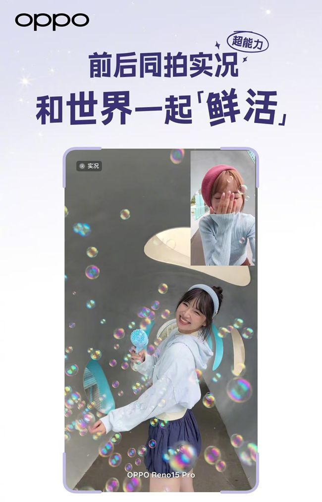 OPPO Reno15系列配备前后同拍实况功能,在分享穿搭时,既能清晰呈现OOTD的细节之处,又能同步记录下自己的实时状态与反应;借助“出圈实况拼图”这一实用功能,还能快速提取动态人像,一键生成富有创意的海报,无论是旅行打卡留念,还是参加爱豆签售会等场合,都能让拍摄玩法充满新鲜感。而且整个过程无需进行后期剪辑,每一张实况自拍都可以直接分享出去,真实感十足,在社交平台上轻松收获更多点赞。