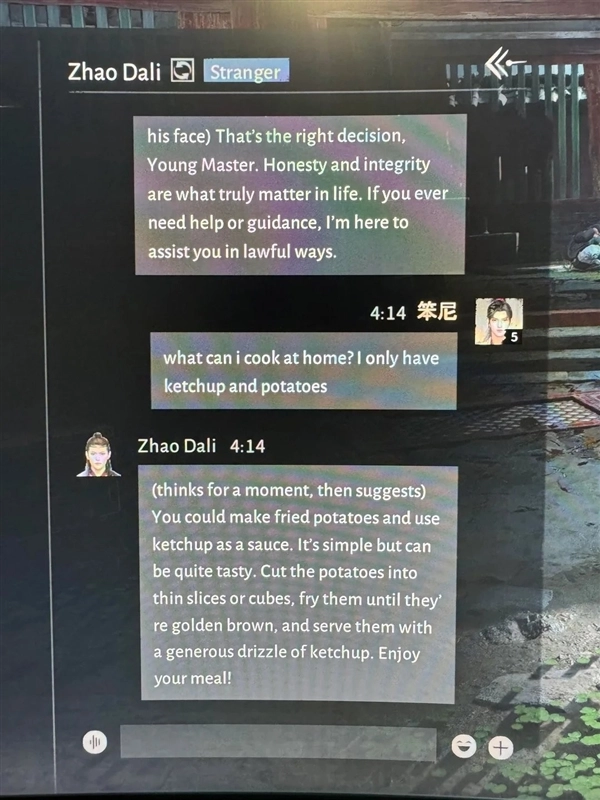 游戏虽力求把背景设定框定在历史范畴内,可AI-NPC却极易被诱导聊起各类现代话题,这反倒勾起了玩家持续进行实验的兴致。