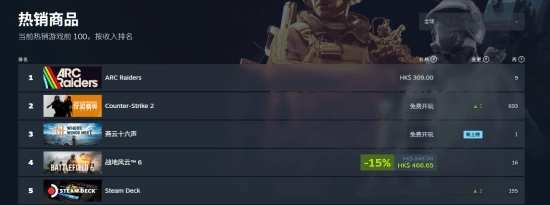 此外,这款作品依旧牢牢占据全球热销榜第三名的位置,领先于热门射击游戏《战地6》和Steam掌机SteamDeck。