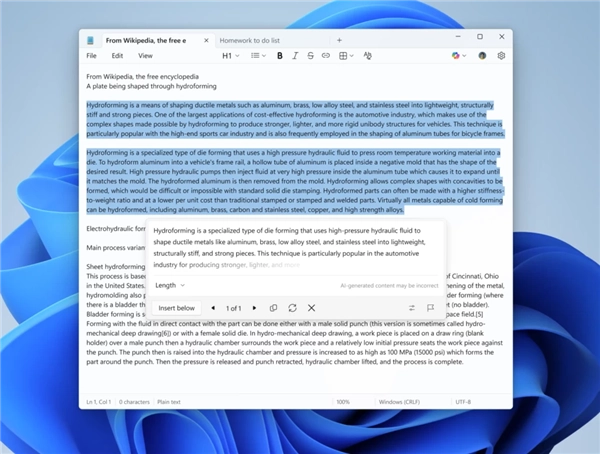 除了表格功能外,记事本的最新更新还优化了内置AI功能的使用体验,让“生成”“重写”“摘要”等功能的运行速度得以提升。