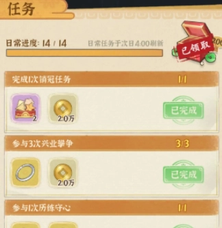 5、日常任务:完成日常任务大概能获取17万通宝。具体如下,成为一次销售冠军可得2万;参与三次兴业攀争得2万;参与一次历练守心得2万;摆放一次同心灯展示得2万;在同文斋参加一次宴席得2万;在翻糖合合中点击生成五次道具得2万;参与两次星宫探索得5万;在客梦斋给梦客送礼一次得2万。