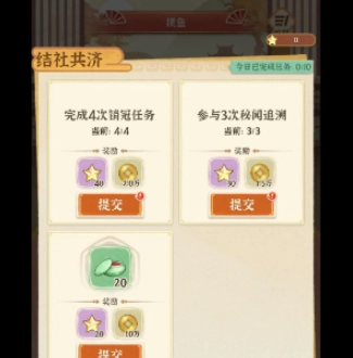 13、结社活动-结社共济:完成并提交10次任务可获得10至20万通宝。