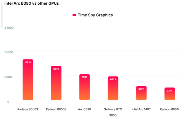尽管跑分和实际游戏表现不能完全画等号,但这个分数依旧十分亮眼——差不多是AMD RDNA 3.5架构Radeon 890M的两倍;对比RTX 3050桌面版显卡约6323分的成绩,锐炫B390的性能大概快了12%。