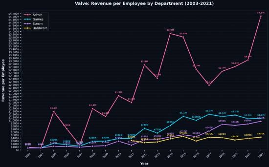 根据数据分析网站Menlo Ventures分析师Didi Das的最新估算,V社(Valve)去年的收入超过170亿美元(约合人民币1208亿元),而公司员工总数仅为336人。凭借这一数据,Valve跻身全球IT行业最具生产力的公司之列,人均收入超过5000万美元。