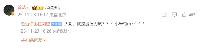 值得一提的是,小米集团新任公关部总经理徐洁云在李肖爽评论区留言“望周知”。
