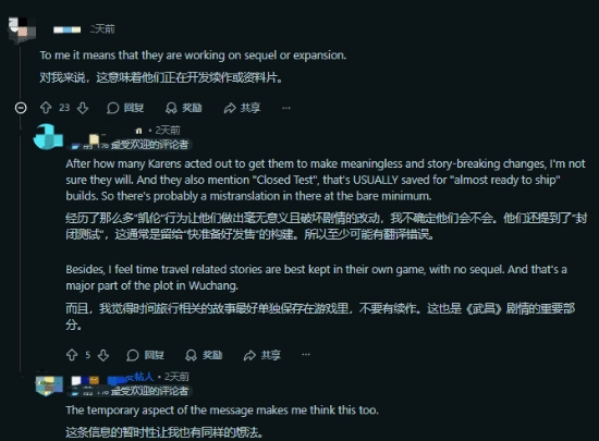 11月28日,玩家@Lexrios在海外玩家社区reddit上发帖询问:“《明末:渊虚之羽》是否还有后续更新?能否有中国玩家帮忙解释一下。”而促使他发出这一疑问的,正是游戏中新增的一段结语内容。