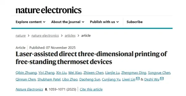 12月1日消息,据报道,厦门大学萨本栋微米纳米科学技术研究院吴德志教授团队在3D打印技术领域取得重要突破,他们创新提出“激光原位诱导直写打印”技术,将热固性材料三维柔性器件的固化时间从传统工艺的数十小时大幅压缩至0.25秒,成功了该领域长期存在的成型速度慢、工艺复杂、性能难以精准调控等核心问题。