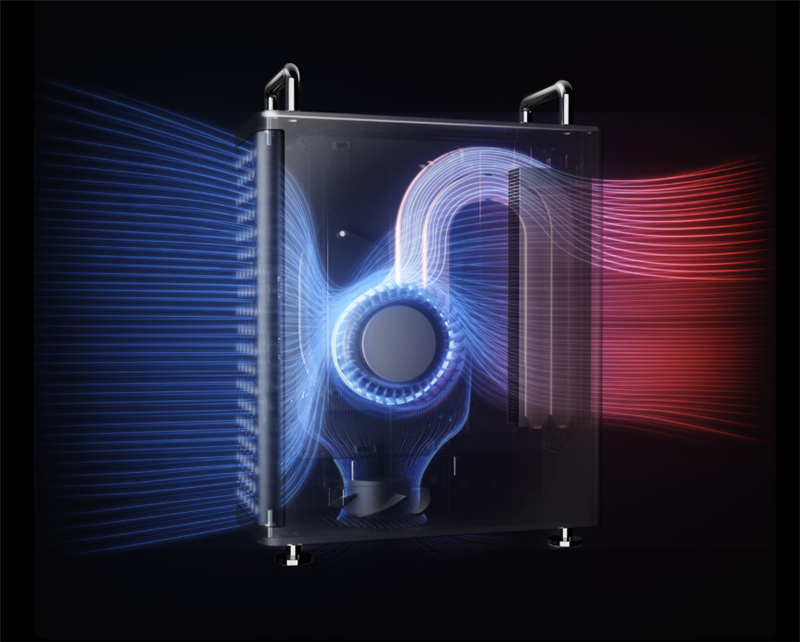 主机内部配备了一套立式“黑鲸”涡轮散热系统,搭载双涡轮静音风扇,构建出立式贯穿式风道,配合全铝机身,散热表现较常见的平躺式迷你主机有显著提升,即便满载运行一小时,噪音也可控制在35dB以内。