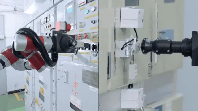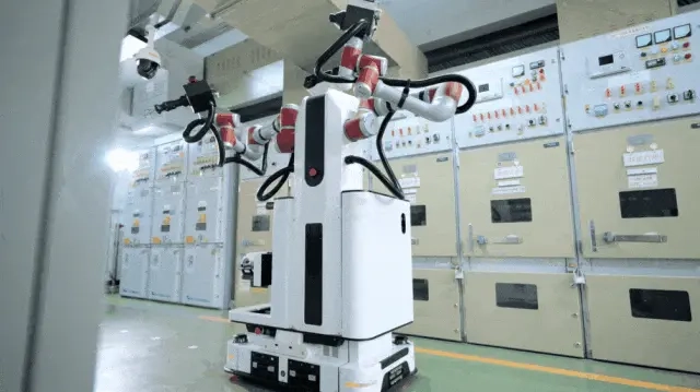 在南方电网广东广州供电局的一座220千伏变电站高压室内,“钧仪”正开展高危环境下的巡检作业,凭借高精度的双臂协作与多线程并行能力,完成开关柜巡检、按钮操作、手柄切换等复杂任务,达成无人化巡检操作目标。