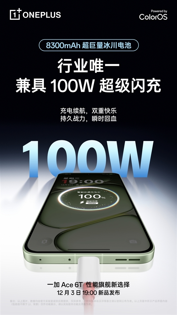 11月28日消息,一加中国区总裁李杰透露,一加Ace 6T将全球首发8300mAh超巨量冰川电池,这款机型凭借该电池成为当前全球电池容量最大的性能旗舰,标志着旗舰手机电量正式迈入8000+mAh时代。