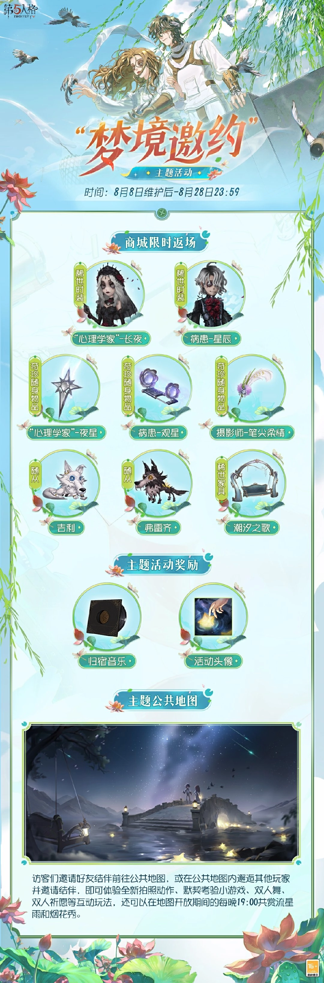 “梦境邀约”主题活动会在8月8日维护结束后正式开启,只要完成指定任务,就能获取归宿音乐、活动头像等奖励。