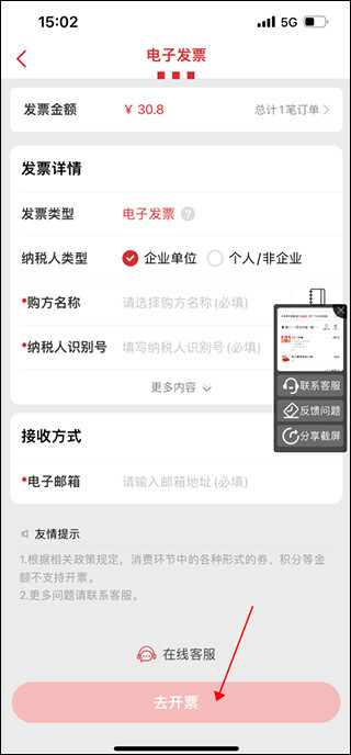 进入开具电子发票的页面后,依据页面上的提示填写好相关信息,最后点击页面下方的“去开票”按钮就可以了。
