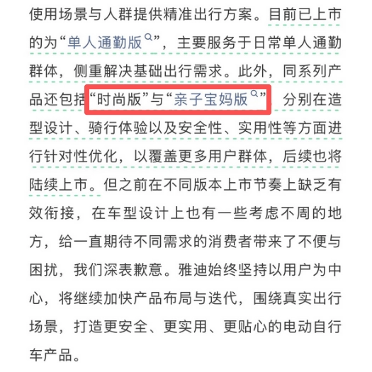雅迪之所以被全网调侃,问题出在它只推出了“单人通勤版”,另外两个版本还处于设计阶段。对此雅迪也坦言,这是他们在产品规划节奏上的疏漏——不该用一款不够全面的产品来定义整个系列的形象。后续会加快推出其他版本,完善“毛豆”系列的产品矩阵。