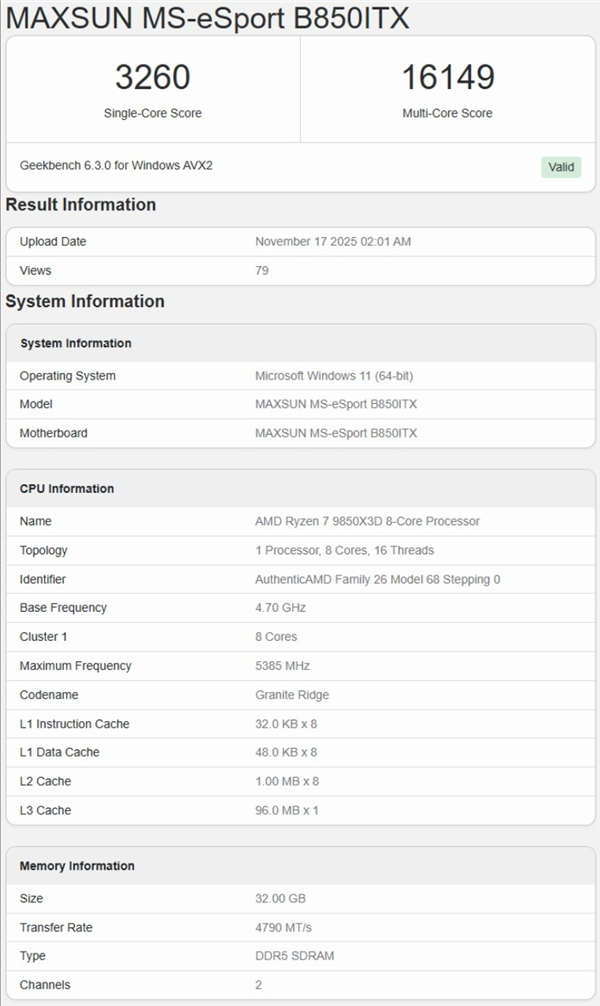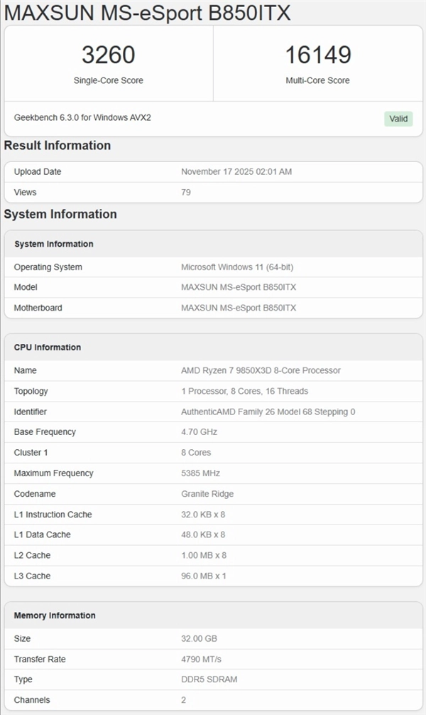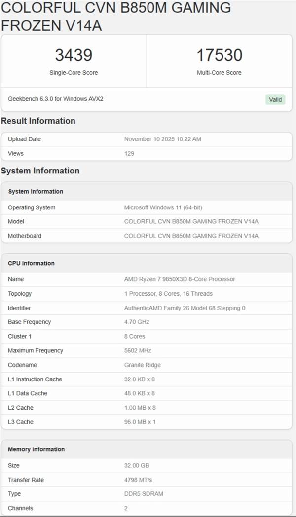 网友@Olrak29_在GeekBench数据库中曝光了锐龙7 9850X3D的跑分数据,测试所用主板分别来自七彩虹和铭瑄。不过这两项测试中处理器的频率存在差异:搭配七彩虹主板时频率达到5.6GHz,而搭配铭瑄主板时识别出的频率仅为5.38GHz,这比之前传闻的频率低了200MHz。