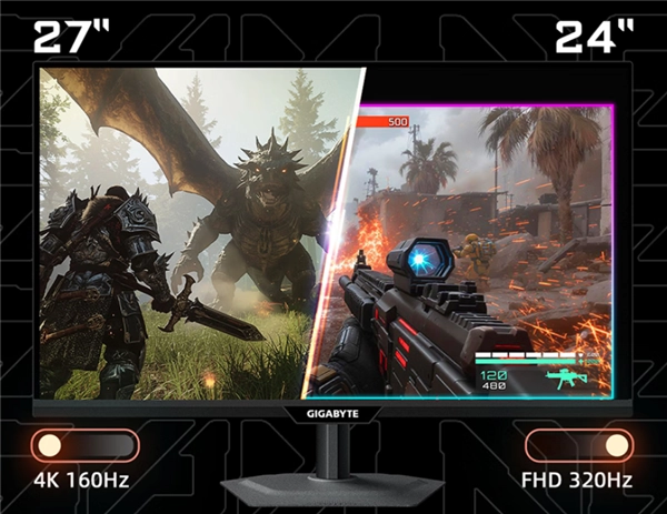 和传统显示器比起来,技嘉M27UP-QZ最突出的优势在于能够在1080P@320Hz与4K@160Hz这两种显示模式间随意切换,同时还兼容16:9、4:3、5:4等多种画面比例。在1080P分辨率下,它可以实现像素点对点的画面缩放,模拟出24寸显示器的实际视觉效果,这样就能满足FPS玩家对画面“尽收眼底”、无视觉死角的控场要求,帮助他们提升瞬间反应能力。而这些不同模式的切换,只需要按下显示器中间的“战术键”就能马上完成,让用户可以更灵活地应对各种使用场景的需求。