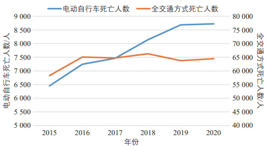 从下面这个图就能清楚看到,2015到2020年期间,电动自行车交通事故的死亡人数从6453人上升至8724人,年均增长幅度为5.1%,这一增速远远超过了全部交通死亡数据1.7%的增幅。