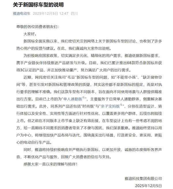 很多时候是厂商忽略了这个问题,比如就在今天,雅迪就对这事儿做了道歉,说是因为设计的时候没考虑清楚。