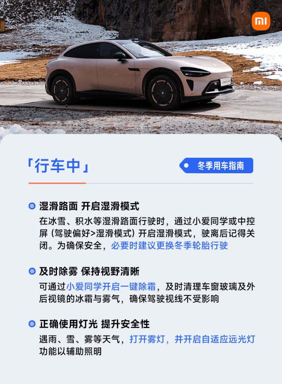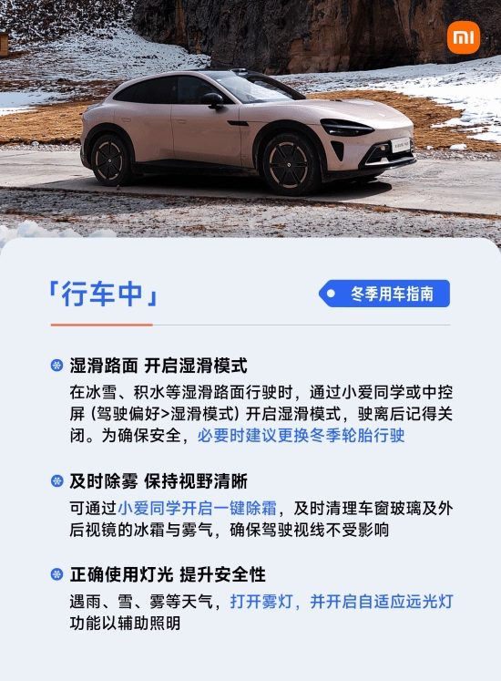 在车辆行驶途中,若遇到湿滑的路面,需要开启“湿滑模式”(该功能可借助小爱同学语音指令或中控屏幕手动操作来实现);如果情况有必要,建议及时更换冬季轮胎。