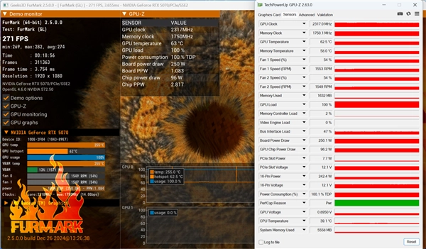 在室温21℃的环境中,使用Furmark连续烤机30分钟后,默认考机功率可以跑到250W,此时GPU温度为62.5℃,显存温度为58℃。考虑到该显卡的散热规模,这样散热表现相当不错~此时风扇的转速保持在1500RPM左右,风扇噪声很小,安静创意无限!