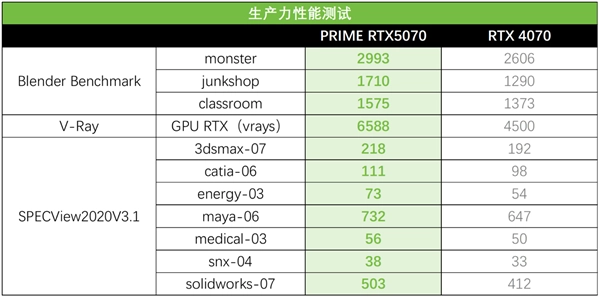 在3D设计工具软件的测试场景下,PRIME RTX5070的整体表现平均比RTX 4070高出约21%。其中领先优势最为显著的是V-Ray GPU RTX渲染项目,差距达到了46%——这一结果充分体现出RTX 5070搭载的新一代RT Core在运行效率上的突出优势。而在其余测试项目中,它也基本稳定保持着15%上下的领先幅度。值得期待的是,随着未来众多3D设计软件逐步增加对DLSS 4的支持,软件的实时预览体验将更加流畅,届时PRIME RTX5070有望为用户带来更为显著的效率提升。