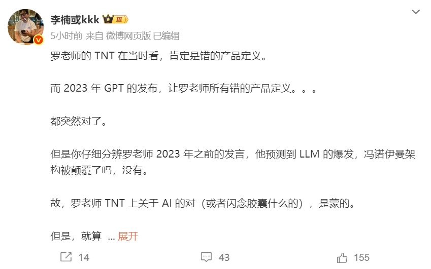 老罗至今仍觉得当初的产品决策没有问题,症结在于资源匮乏。倘若当年没有开发TNT,保持小而美的运营状态,或许就能坚持到AI时代来临。