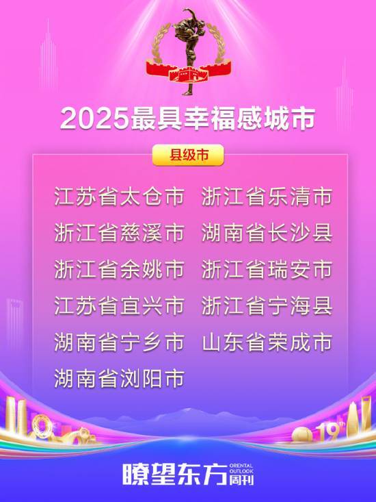 “2025最具幸福感城市”(县级市)的推选结果出炉,江苏省太仓市、浙江省乐清市、浙江省慈溪市、湖南省长沙县、浙江省余姚市、浙江省瑞安市、江苏省宜兴市、浙江省宁海县、湖南省宁乡市、山东省荣成市、湖南省浏阳市入选。