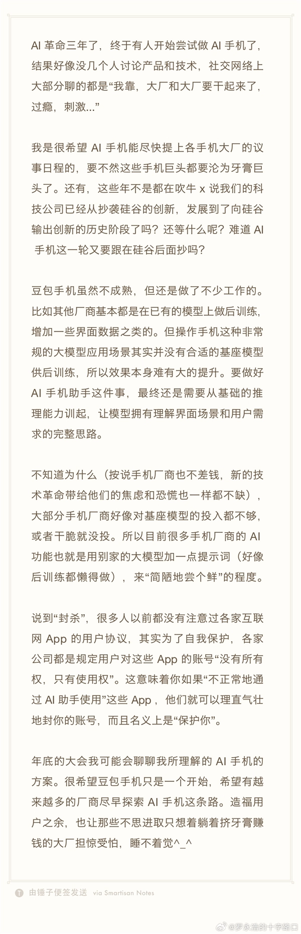 最后罗永浩提到,他计划在年底的科技春晚上谈谈AI手机,期待豆包手机只是个开端,也希望有更多厂商能尽早涉足AI手机领域的探索。这样不仅能为用户带来福祉,还能让那些安于现状、只想靠挤牙膏式更新躺着赚钱的大厂感到担忧,甚至夜不能寐。