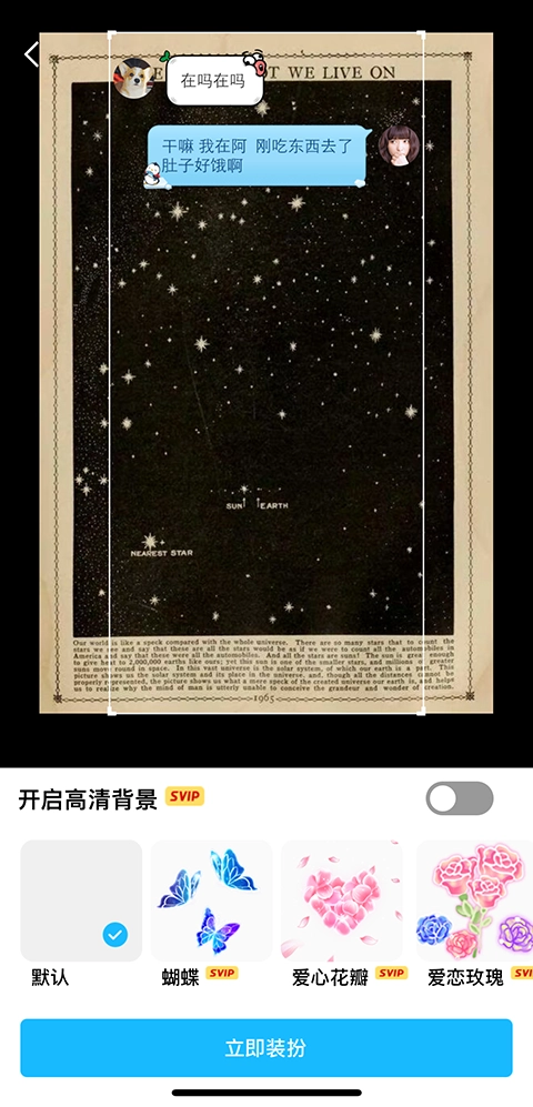 5、要是没找到心仪的背景,还能从相册里自行上传图片来制作,调整妥当后点击“立即装扮”就行啦