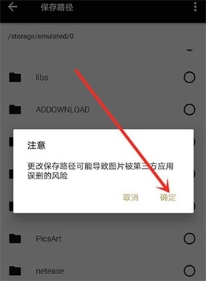 6、若需更改保存路径,可点击“路径的文件夹”,并在弹出的注意对话框中选择“确定”选项。