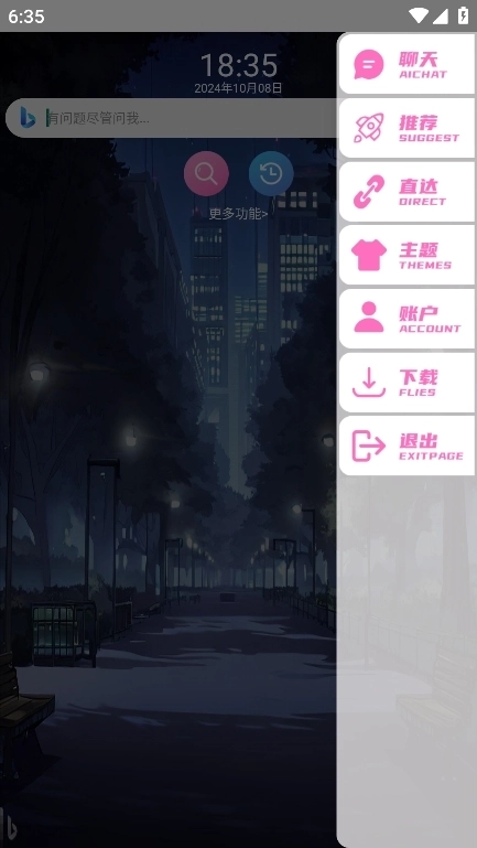 2、点击更多功能后,侧边会弹出菜单栏,其中包含推荐、网址直达、主题、账户等功能选项。