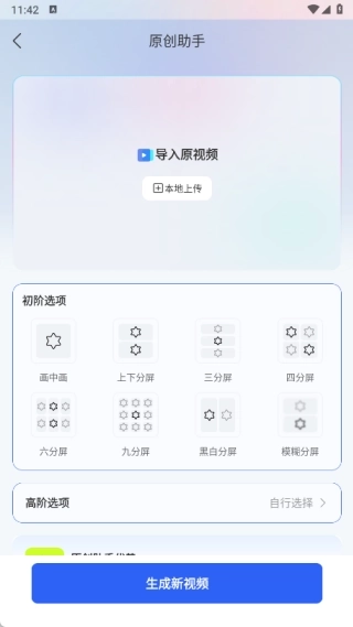 2、点击原创助手按钮,接着导入原视频,随后选择初阶选项与高阶选项,了解原创助手的优势,最后生成新视频。
