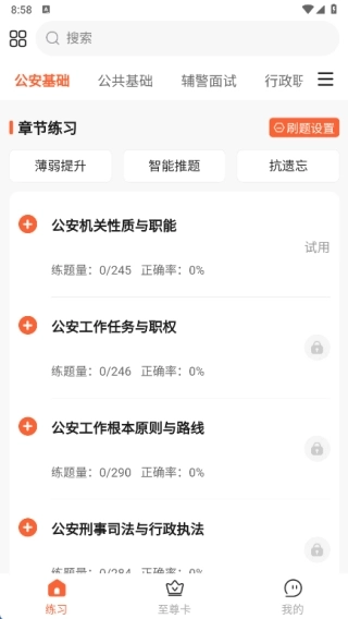 2、章节练习板块支持刷题设置功能,核心包含薄弱点专项提升、智能个性化推题以及抗遗忘巩固训练这三大模块。
