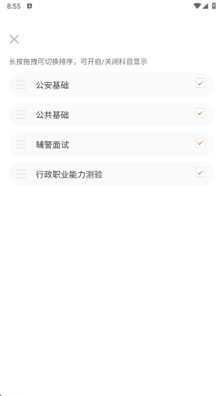 3、点击右上角的三条横线图标,即可在弹出的选项中选择公安基础、公共基础、辅警面试或行政职业能力测验中的任意一个科目。