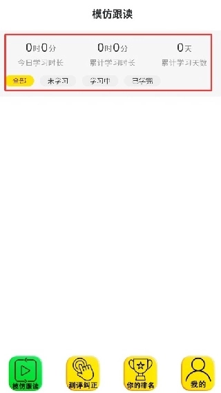 2.在模仿跟读板块中,可以查看当日学习时长、累计学习时长,还有坚持学习的天数。