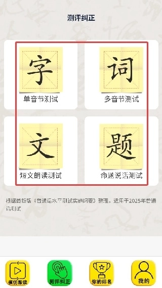 3.借助测评的纠正功能,可针对单音节、多音节、短文朗读和命题说话展开测试。