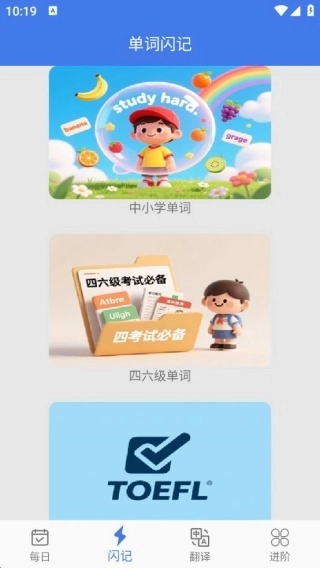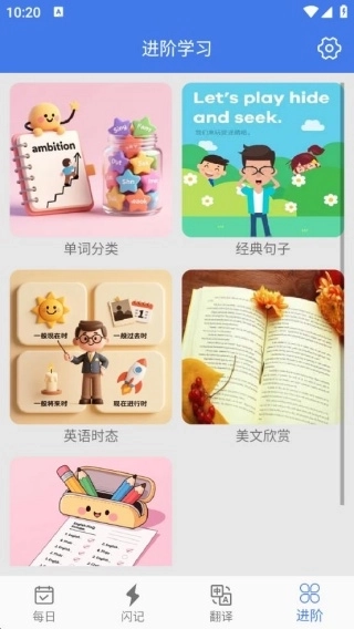 3、每日单词测试、单词闪记等多样化形式助力提升单词记忆效率,进阶学习板块则涵盖了丰富且全面的内容。