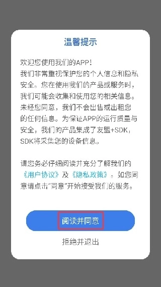 1.首次打开应用时,点击弹窗里的同意按钮,就能进入主界面开始使用了。