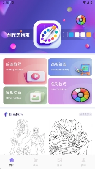 1、首页将呈现绘画教程、画板绘画、模板绘画、色彩技巧等内容,方便用户学习和掌握绘画技巧;