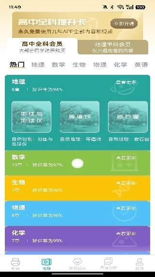 高中地理这款学习软件真的超赞,是专门为高中生设计的,特别是对高三同学备战高考很有帮助。它的知识内容很权威,包含了从高一到高三的各种题目。通过音频和视频相结合的教学方式,能让你更容易理解知识点。知识分类科学合理,方便大家查找,而且可以随时随地刷题,复习效率特别高,赶紧来试试吧!