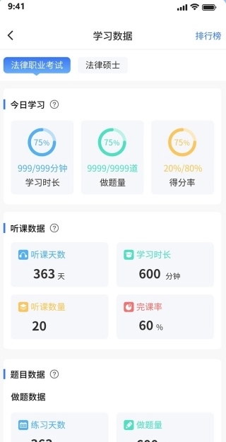 3、在学习数据页面中,你可以查看今日学习情况、听课相关数据、题目相关数据以及做题相关数据等内容。