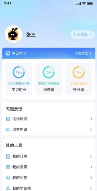 4、在“我的”页面里,既能查看学习进展,也能提交问题反馈,还能使用其他工具。