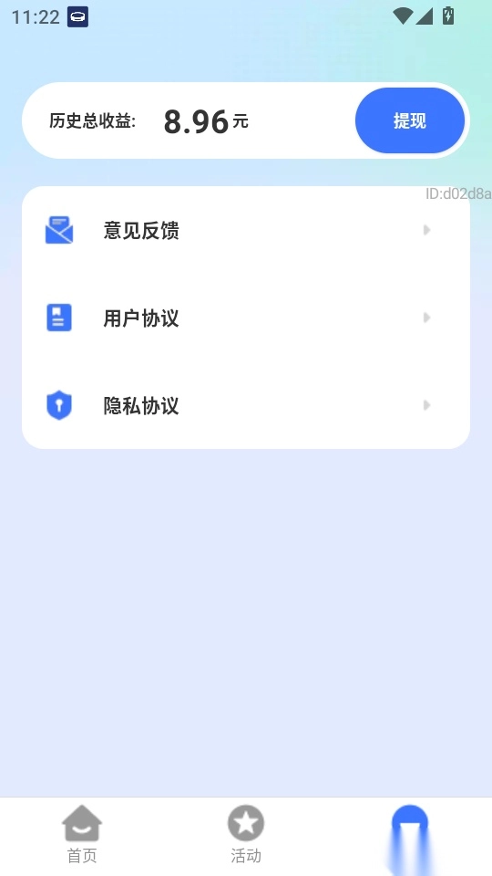 之后找到“我的”功能菜单栏界面底部的“提现”按钮点击进入