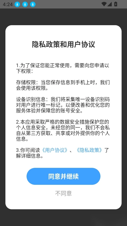 首先打开应用点击“同意并继续”按钮进入中。