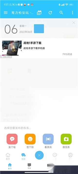 “+”界面:可进行发帖、签到、完成任务等操作,发布个人动态,与社区其他用户互动,从而提升用户的参与感。