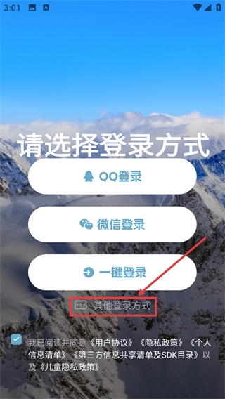 1、在登录方式选择页面点击【其他登录方式】,即可进入手机号登录的信息填写界面。