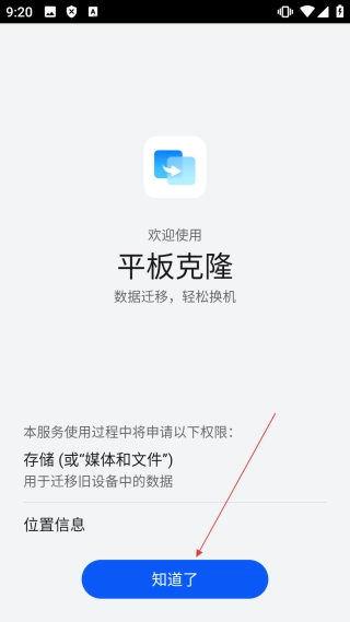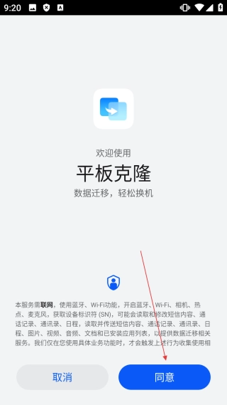 1、在平板克隆的启动界面,点击【同意】按钮,即可进入权限提示界面。
