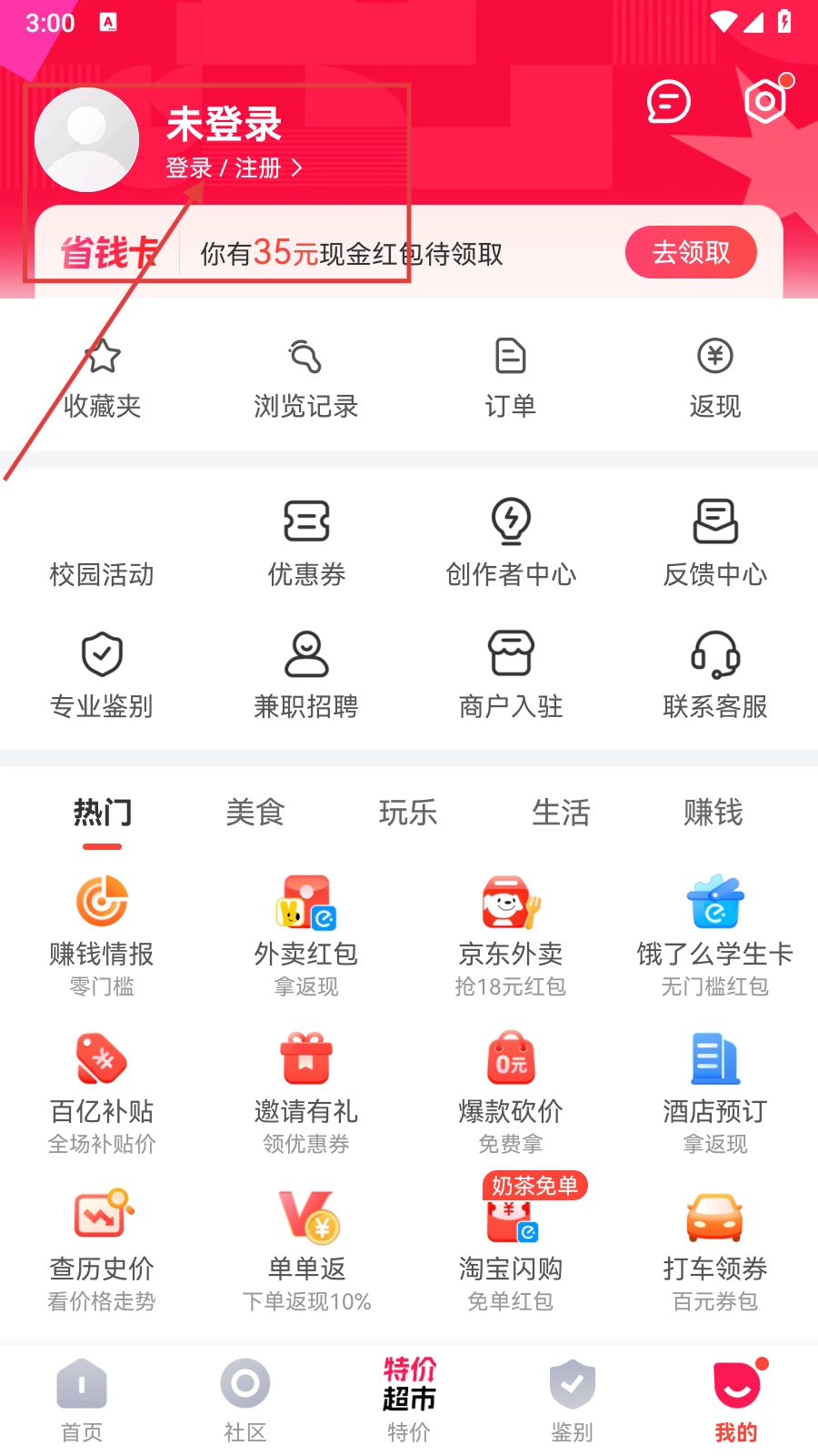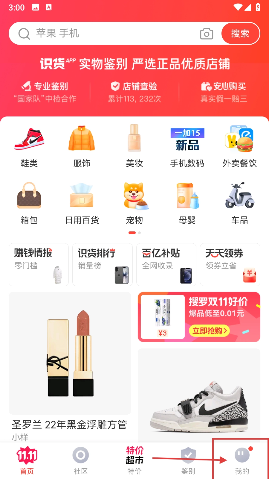1、打开识货首页,点击右下角的【我的】选项,即可进入个人中心页面。