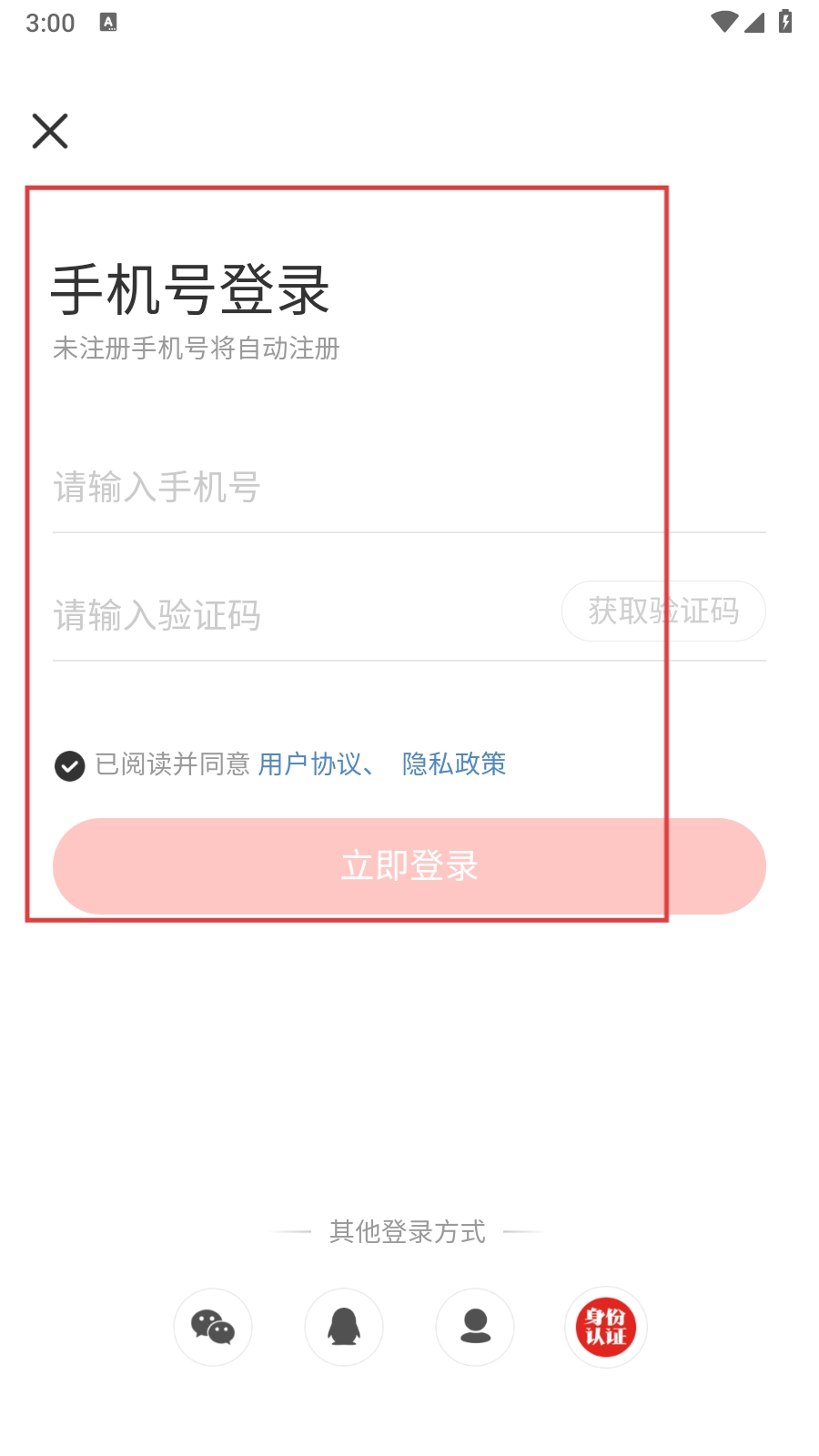 3、在手机号登录界面填写手机号后,点击【获取验证码】按钮。