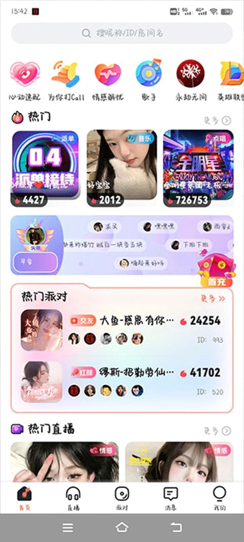 首页顶部设有快捷入口,可直达各类主题语音聊天室、热门派对及直播页面。